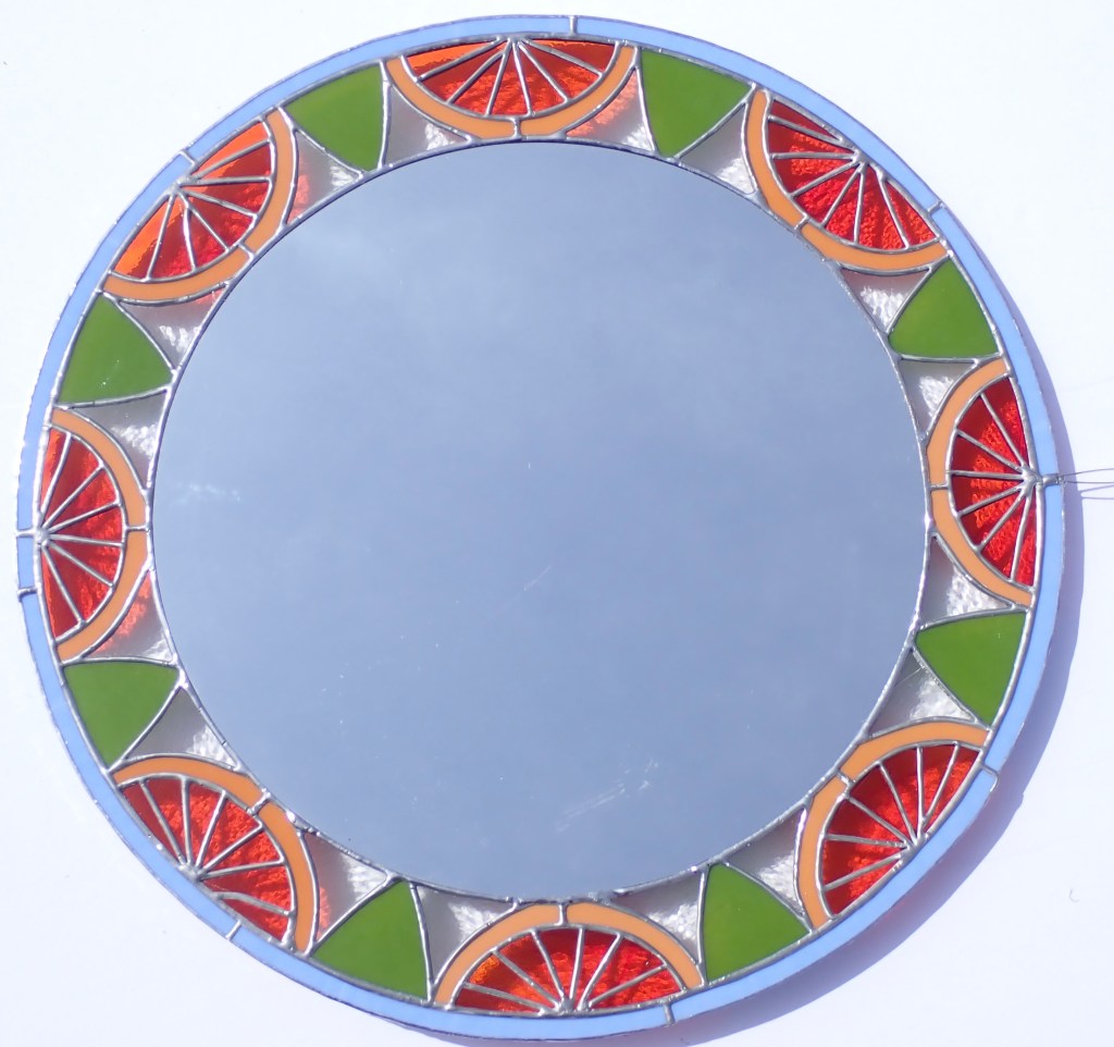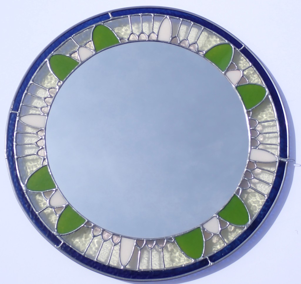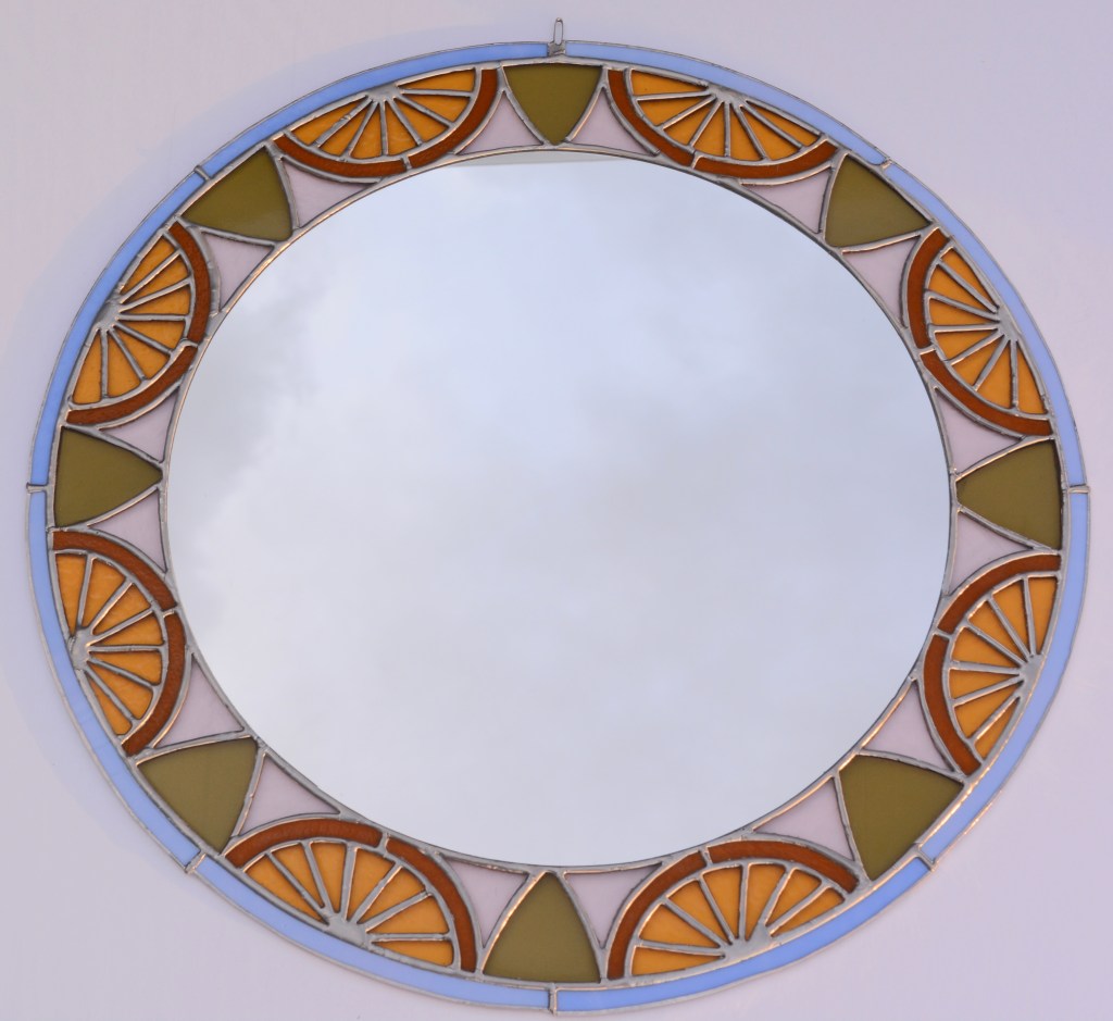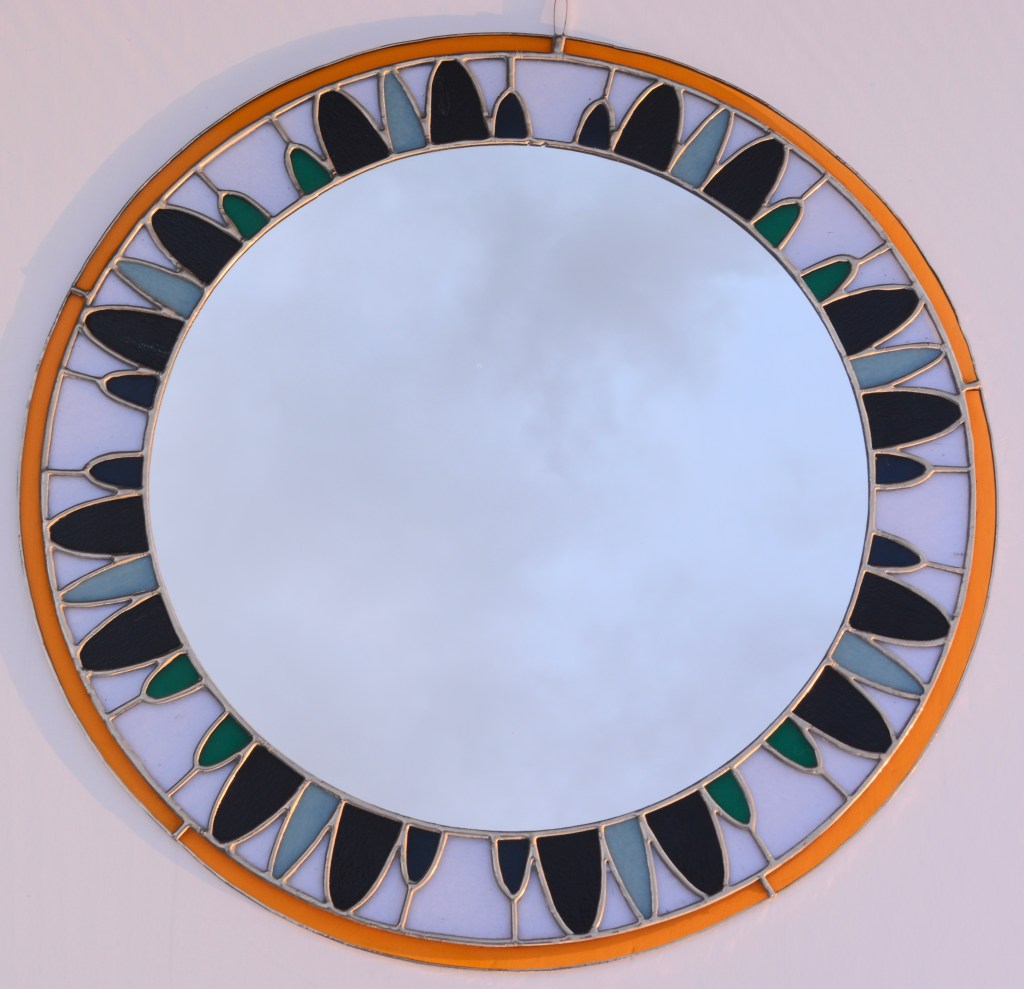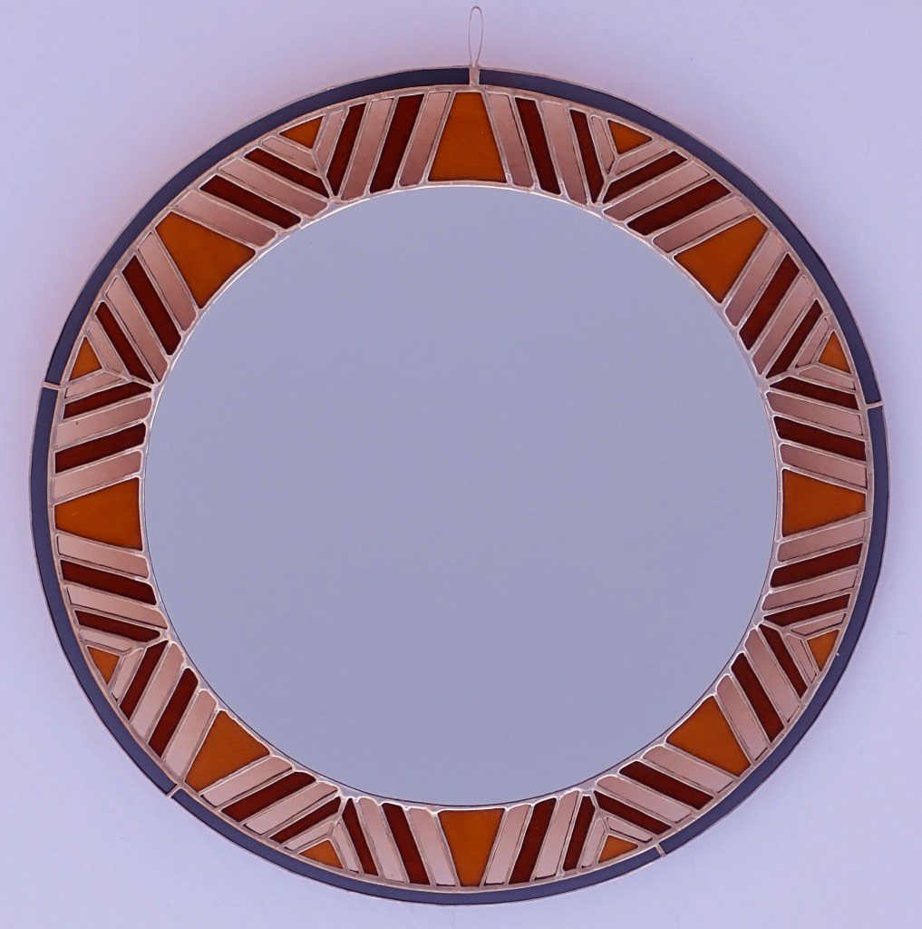 In my stained glass work, I focus on symmetry in my design and use the Tiffany-style technique. My work starts with creating a design in Procreate. Once I’m happy with the design, I print it on sticker paper & adhere it to glass. I then cut the glass, grind it, & adhere copper foil tape. Finally, I solder the pieces together & finish it by applying a finishing compound to preserve the life of the solder. If you have any questions about my process, please reach out to me!